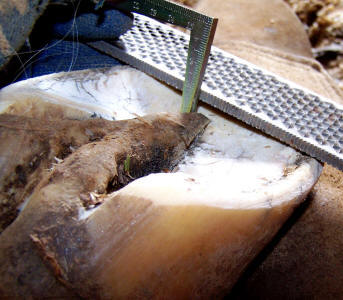 To accomplish this is in the field, hold the rasp “tipped up away from the toe” more parallel to the ground plane of the collateral grooves, rasping the corner of the heel. For example, the Figure 11 drawing would likely have a starting collateral groove depth of 1/8” (3mm) at the apex of the frog and 1-3/4” (43mm) at the deepest point beside the bars.