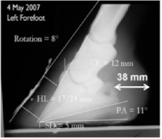 [Fig 2 above] Lateral radiographs above of a laminitis case that was treated with the hoof rehabilitation system. Note the increase in heel depth over the 5 month treatment period. This change is a consistent finding in horses undergoing this method of hoof rehabilitation, although it has never been proven possible.