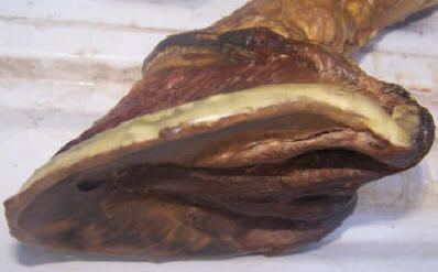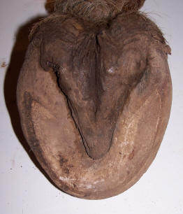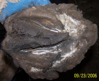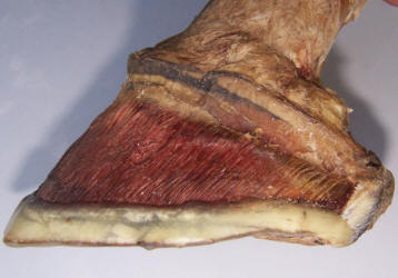 The coffin bone provides the foundation for the front half of the foot; the lateral cartilages form the foundation for the rear half. In this domestic cadaver, everything that is not directly underneath the coffin bone and lateral cartilages has been removed. This divides the heel buttress down the center. In my opinion, everything left here (distal to the corium) is designed primarily for vertical support and energy dissipation. Everything I removed is primarily designed for protection from the elements (This includes the outer half of the heel buttress). The outer wall is a critically important shell, but a shell it is.