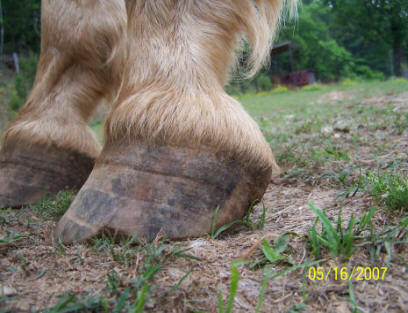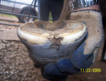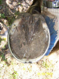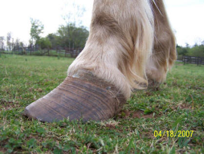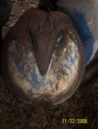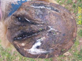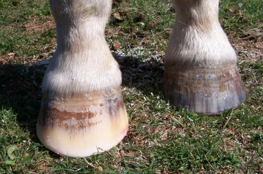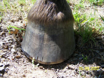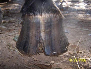 Ripples, grooves and red stripes lined up down the hoof wall. Wall flare or outward deviation or bell shape. Reason for true panic if you see this on your horse. Also note the chunk broken off at ground level in the horse in the left photo. The top of it is parallel to the growth lines. Any time you see a crack that parallels the growth lines, It is either an old abscess that broke thru at the coronet, or an impact that occurred at the coronet. Either way, the crack grew all the way down from the top, and will eventually break off like the one above obviously did.