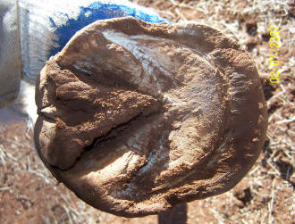 Telltale "hump" or "footprint" of P3 on the bottom of the foot. The material behind the hump is generally sole. The material between the hump and the wall is lamellar wedge. If you see this on your horse: I'll put this gently - Panic. It's time for sweeping dietary changes and improved hoof care.